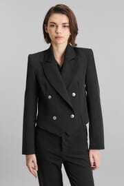 El blazer Midnight tiene calce Slim con largo tipo crop. Cuenta con solapas en pico y broches personalizados. Esta confeccionado en gabardina con forrería personalizada a tono. Hace juego con el pantalón Midnight. Paz está usando en la prenda superior un talle S, y en la prenda inferior un talle S/26. Sus medidas son: Altura 1.73 m. Busto 82 cm. Cintura 60 cm. Cadera 88 cm.
