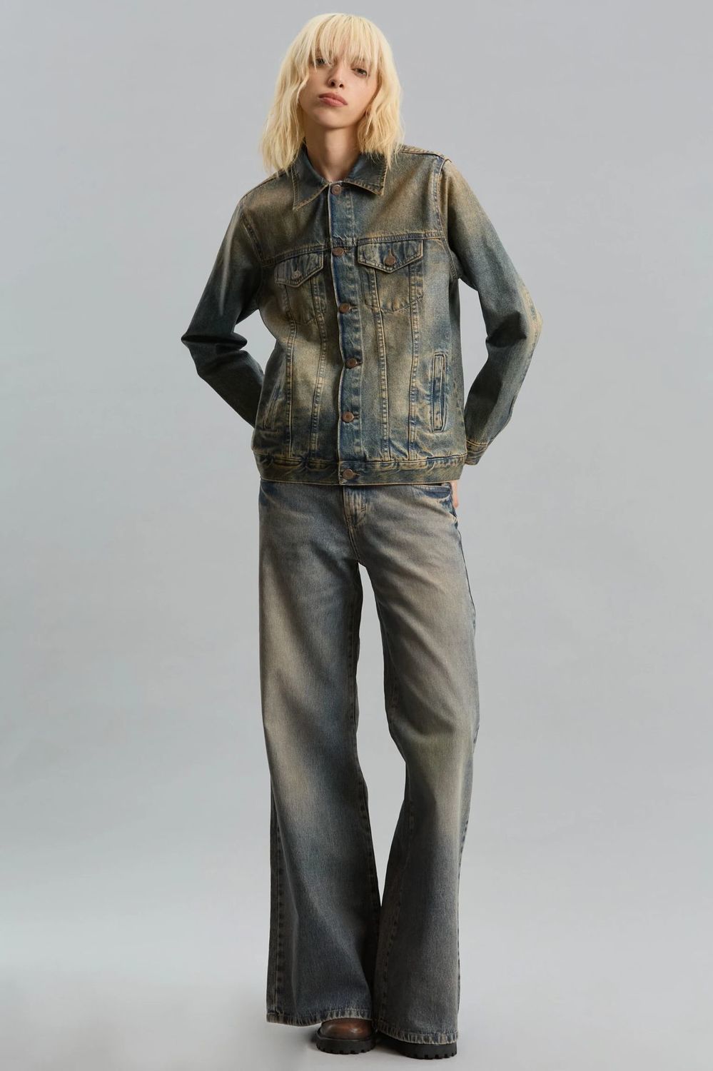 Campera de calce regular y largo hasta cadera. Confeccionado en un tejido 100% algodón. El lavado tiene un proceso matizado, revestido de una resina que aparenta una textura similar al cuero. Estas prendas fueron elaboradas con procesos artesanales es por esto que los tonos pueden variar entre sí. Referencia modelo: Altura 1,78 m. Talle de pantalón: 26. Parte de arriba: S.