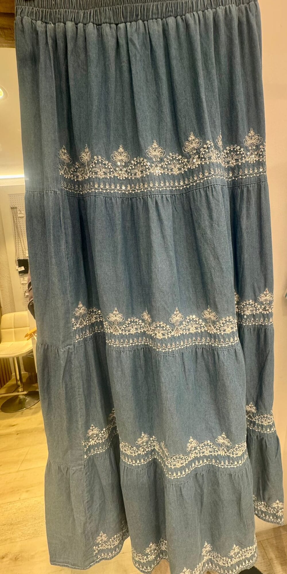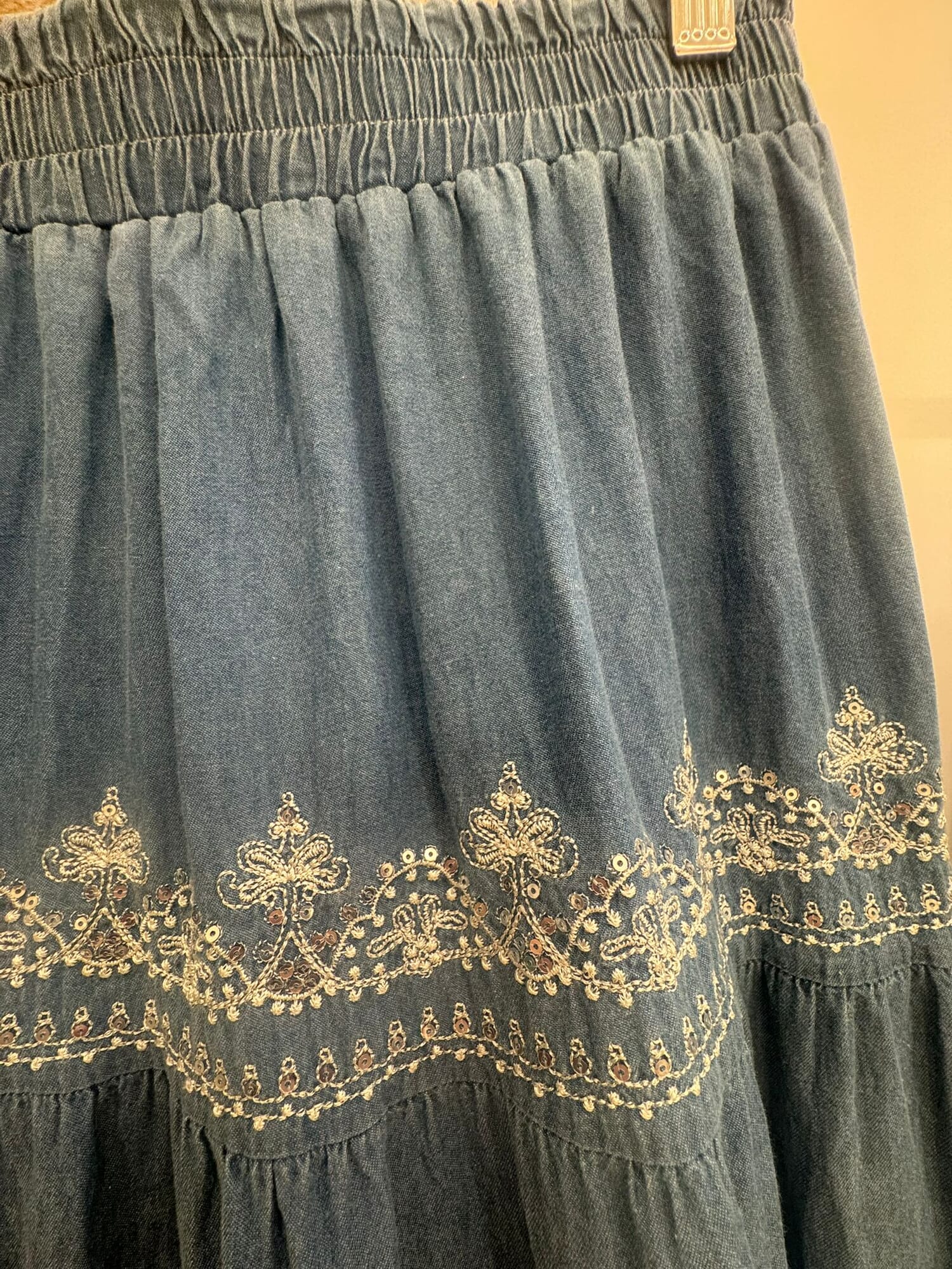Falda de jean en tono clásico, realzada con delicados bordados en lurex plata.