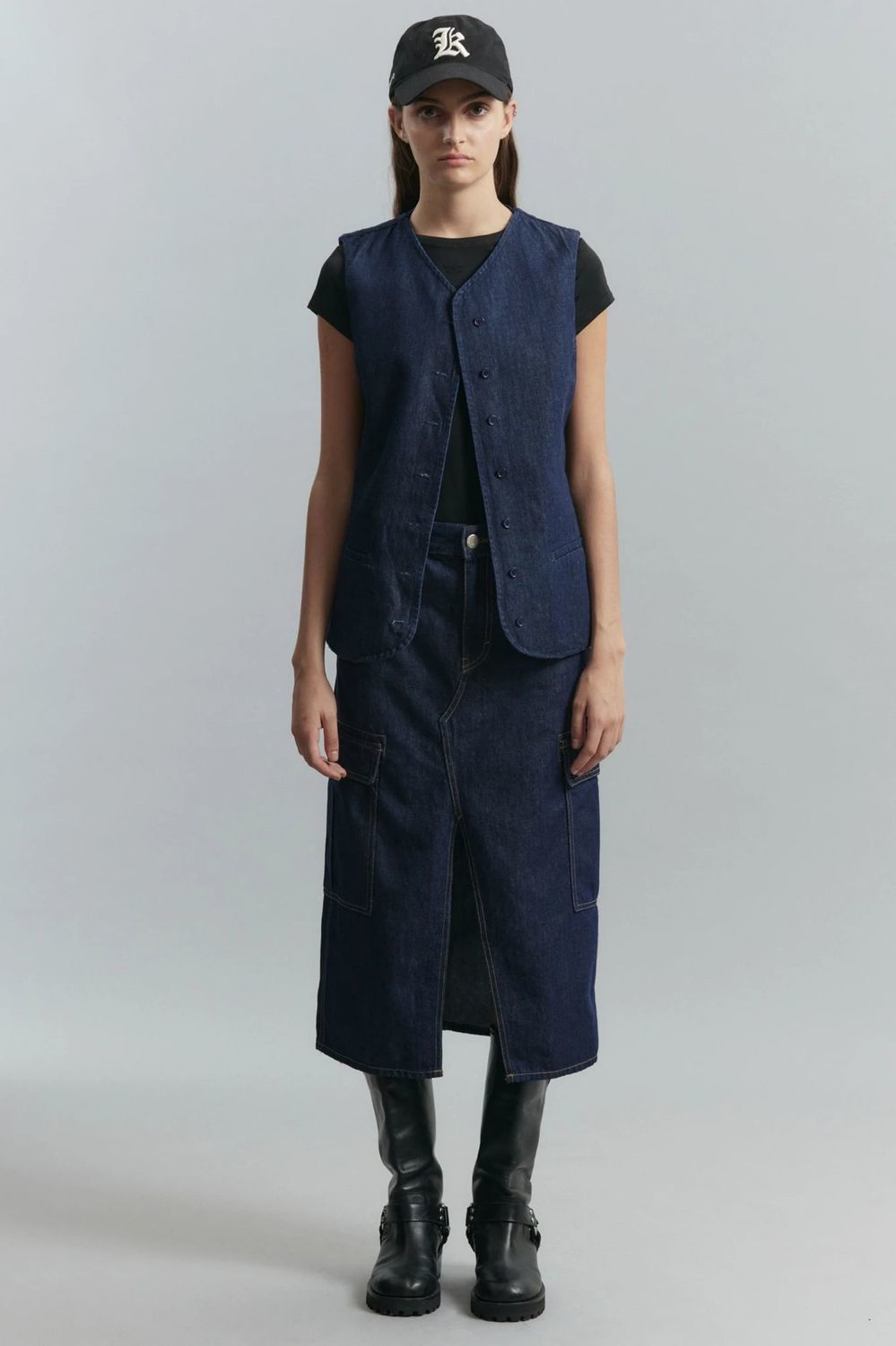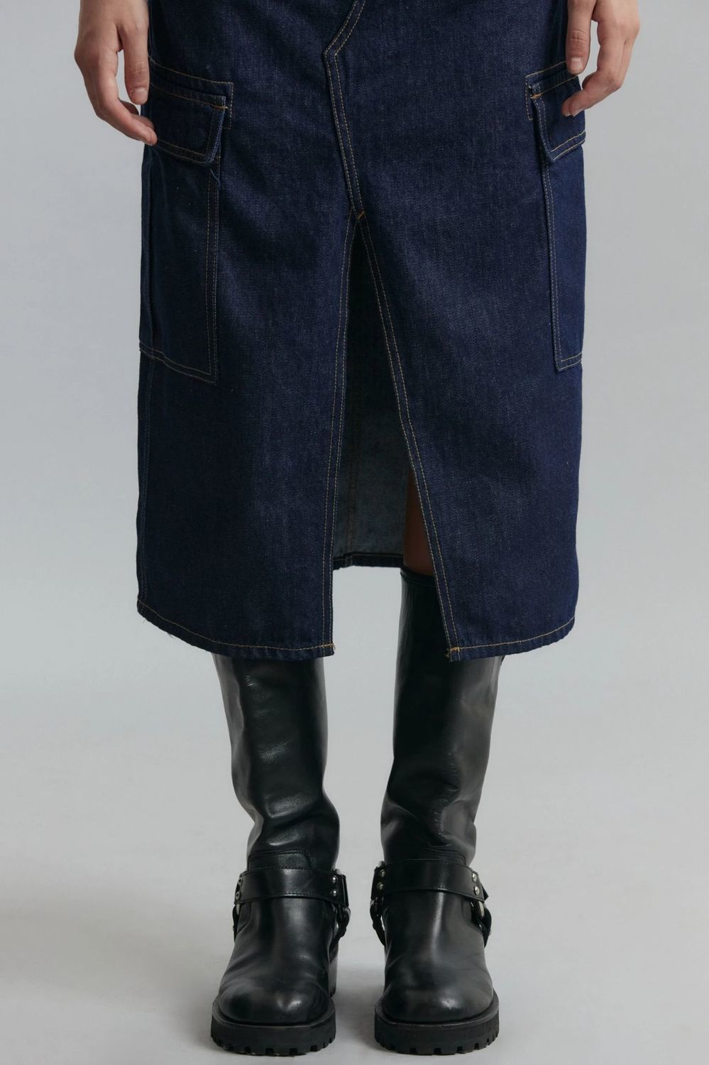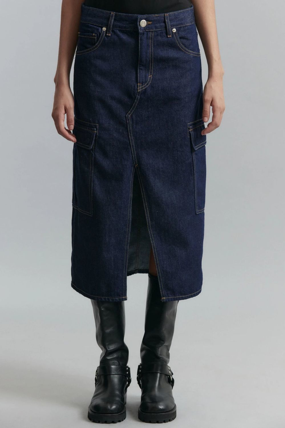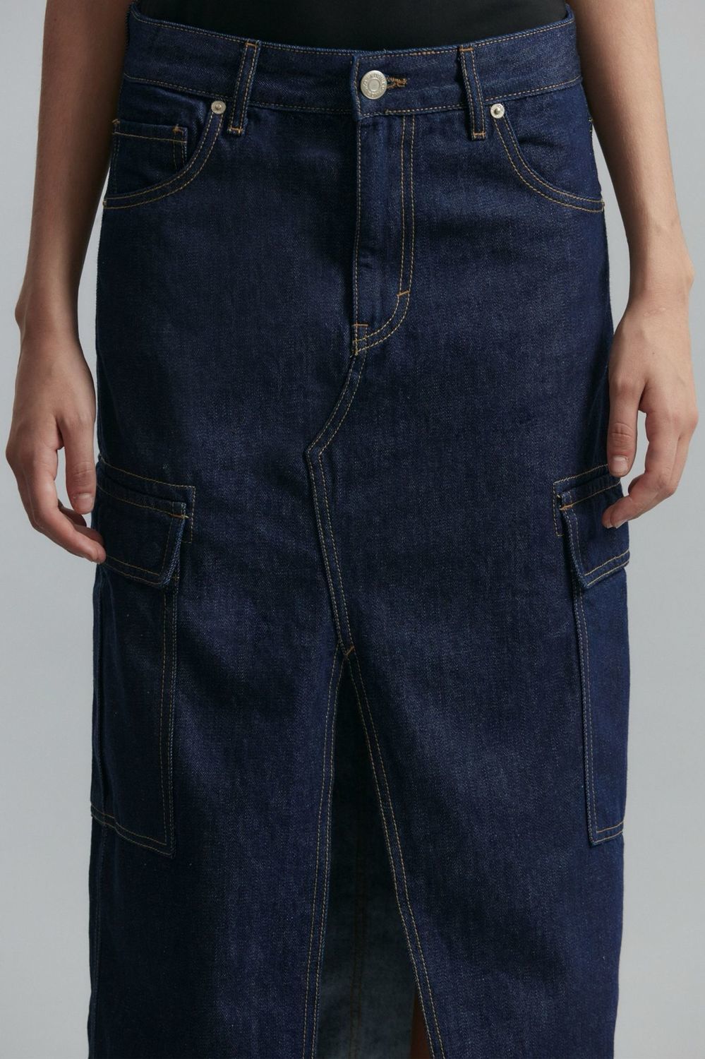 Falda confeccionado en denim 100% algodón liviano. De tiro medio y calce regular. Proceso de lavado “raw” que ayuda a la prenda a conservar su índigo natural. Referencia modelo: Altura 1,74 m. Talle de pantalón: 26. Parte de arriba: S.