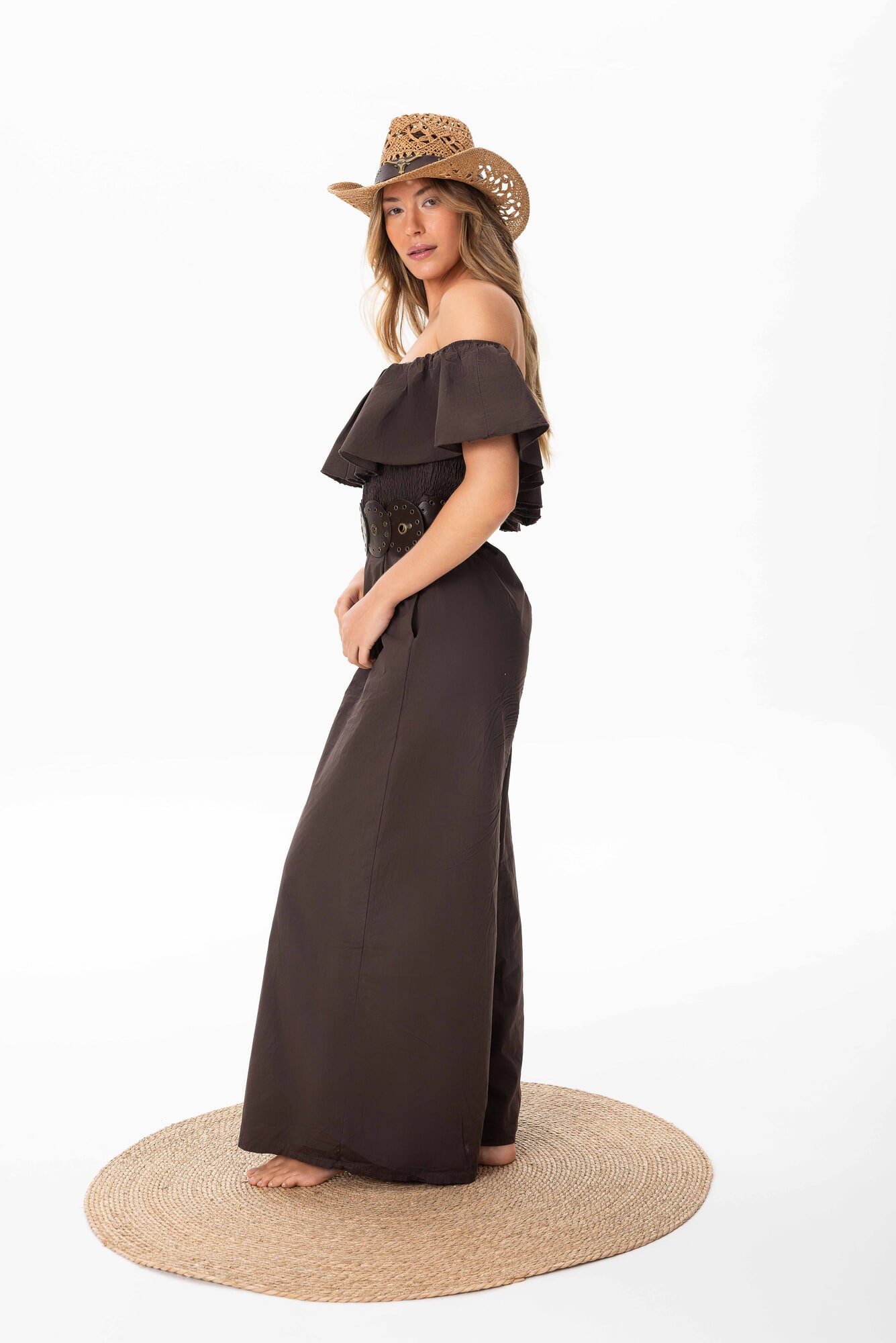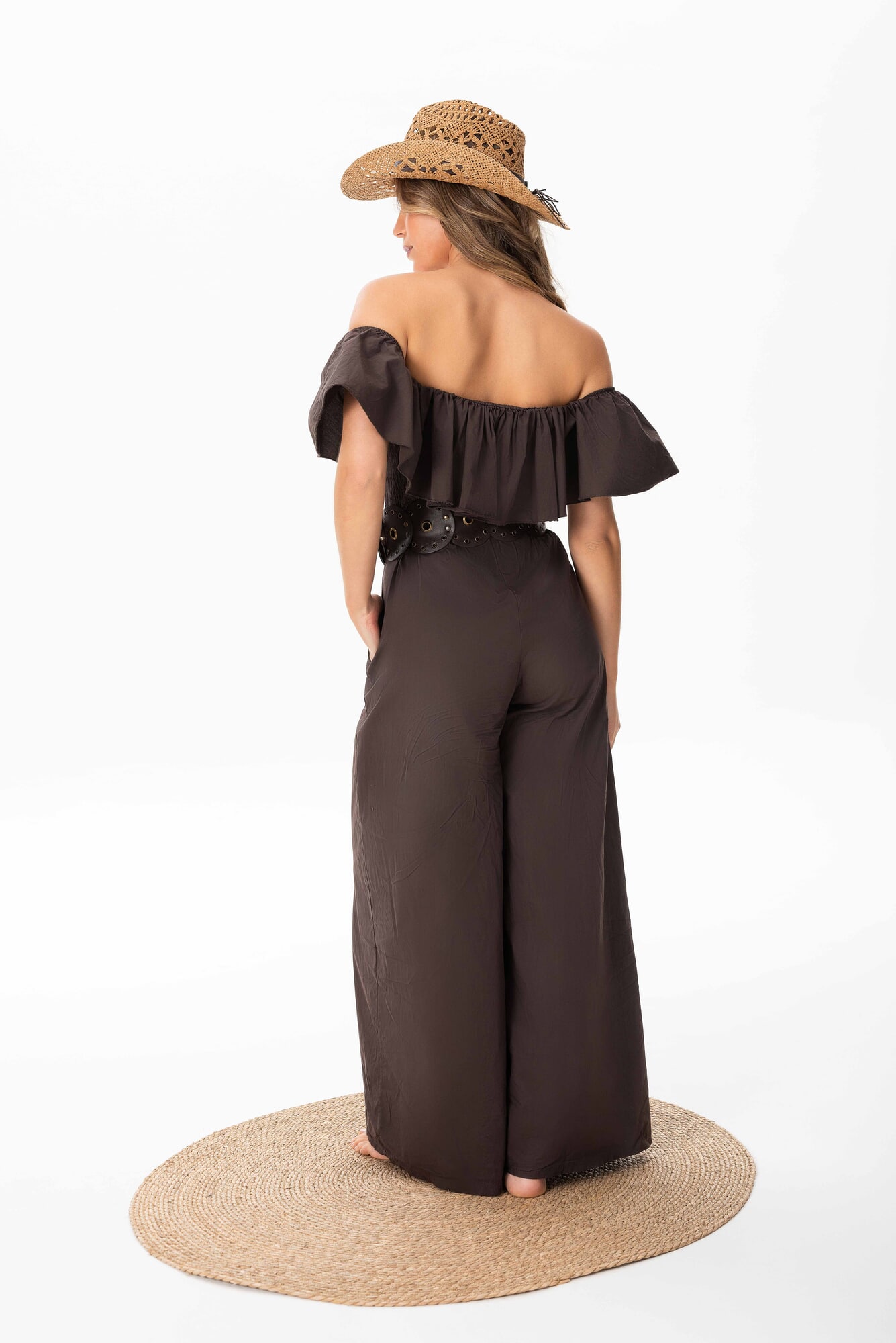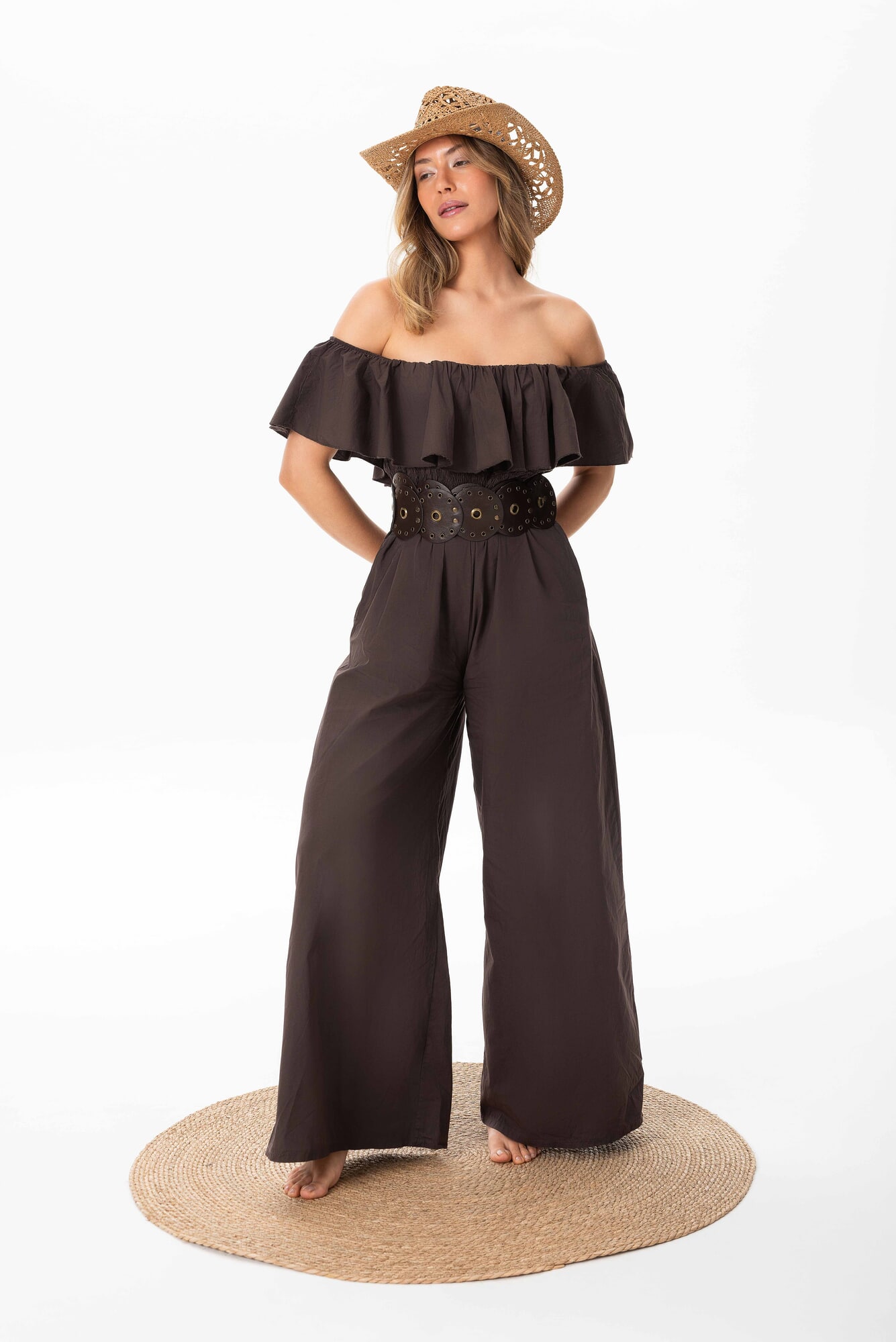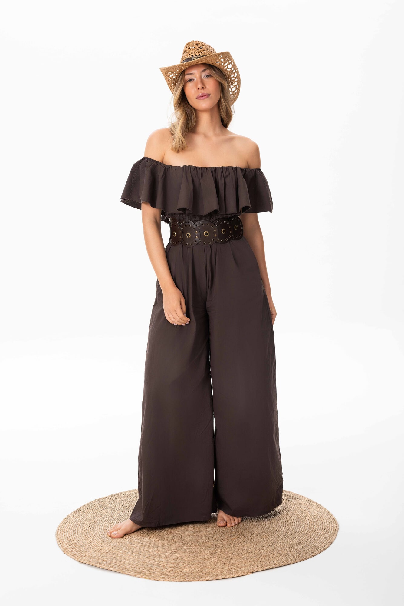 Mono en algodon y elastano, tela fluida y silueta estilizada.  Los volados en hombros aportan movimientos.  Usalo para todas las ocasiones!