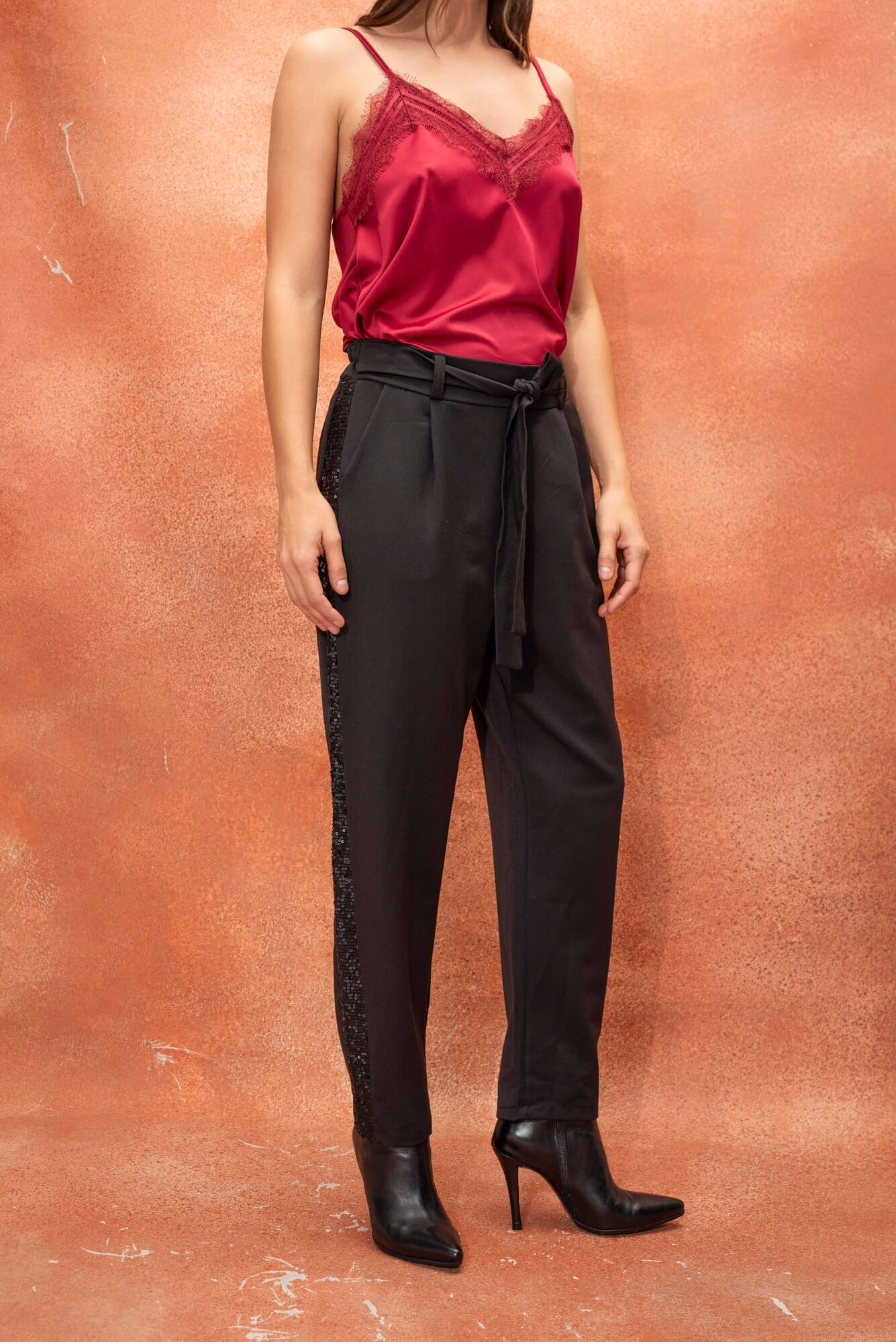 Pantalón tipo sastrero, con cintura atras con elástico para un mejor calce, con franja de lentejuelas negra.