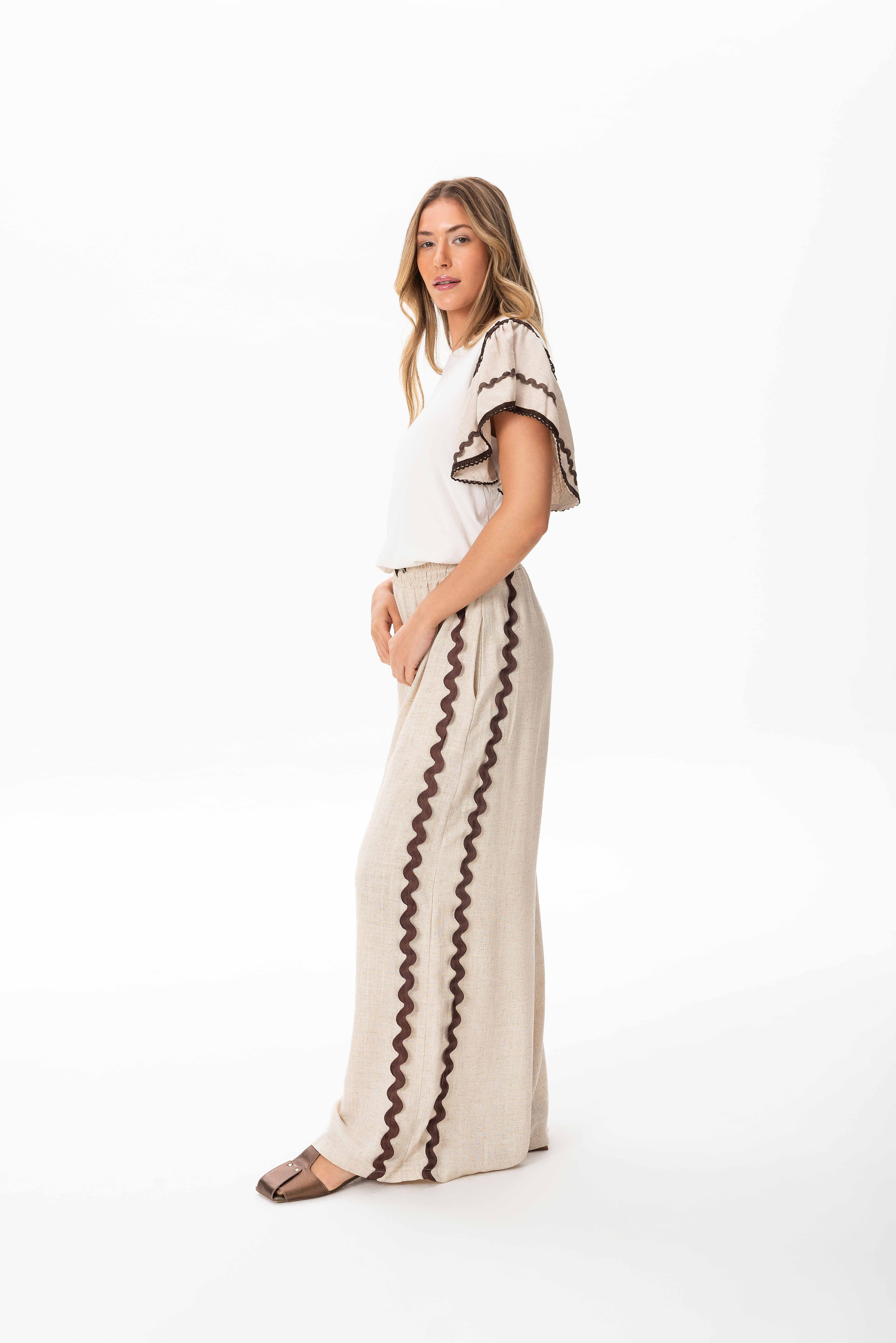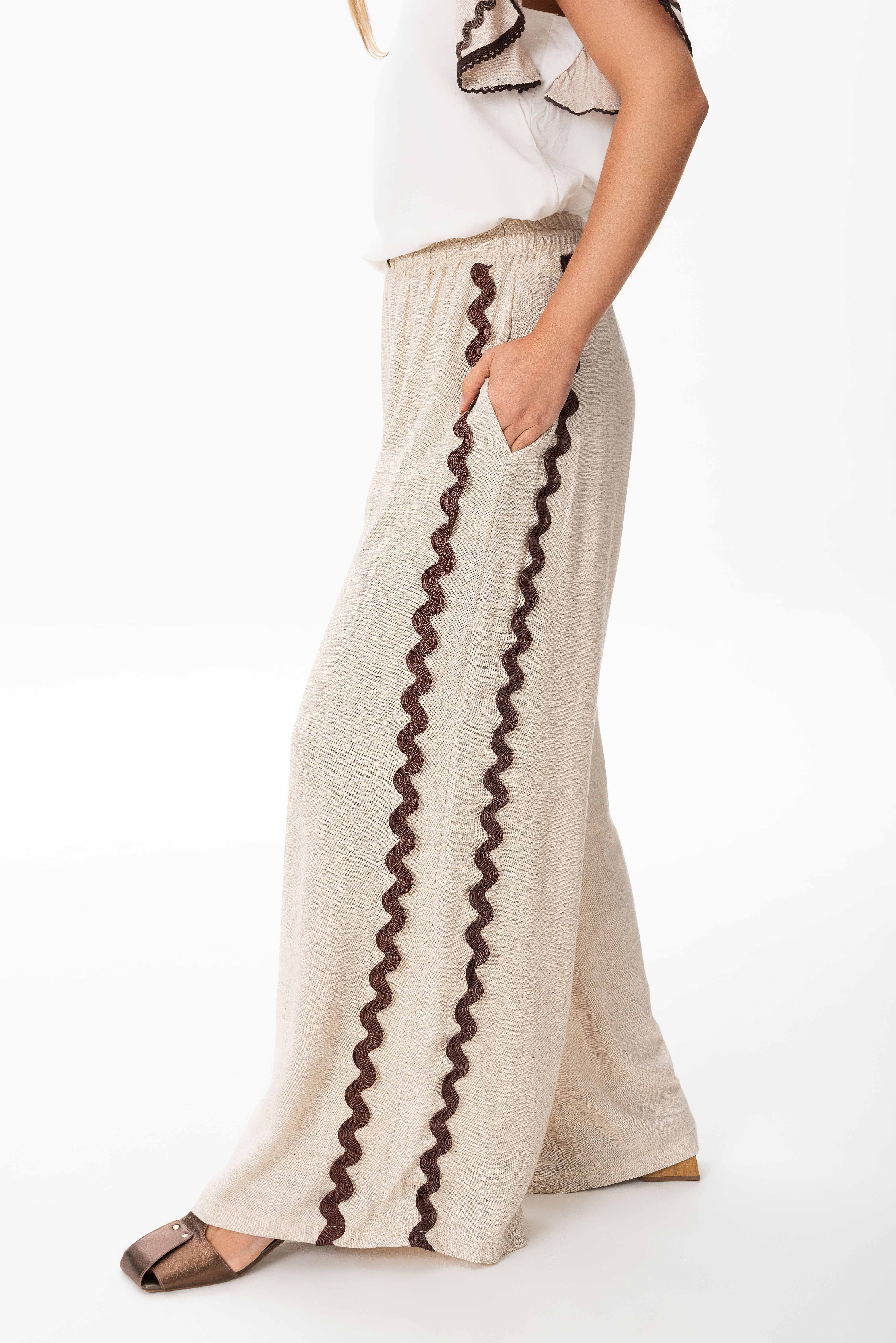 Pantalon en tono beige neutro confeccionado en tela liviana con cintura elastizada, mega comodo, con ribetes en tono chocolate que definen siluera y aportan un contraste único al pantalón.