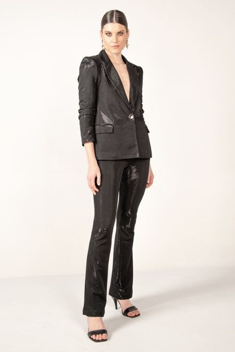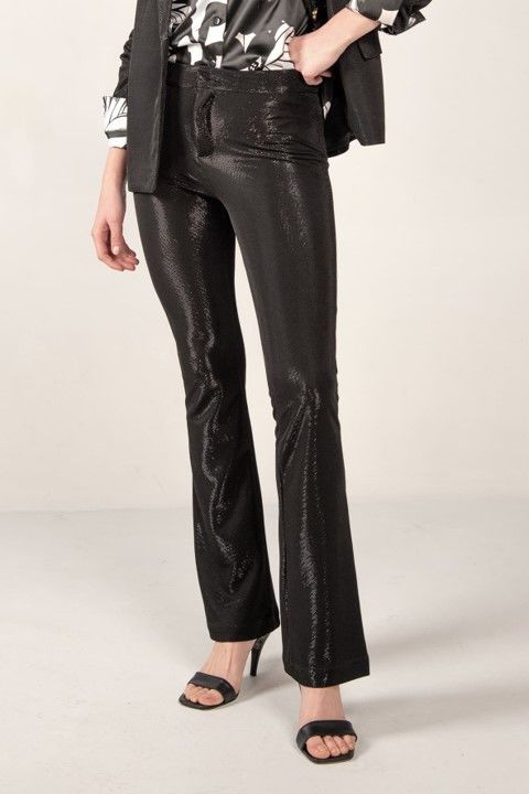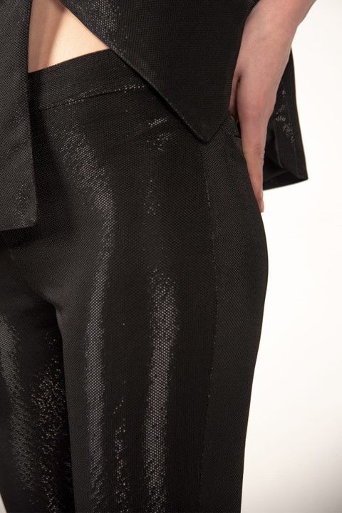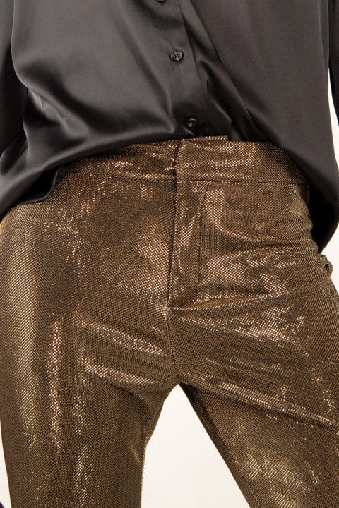 Pantalón tiro alto confeccionado en foil texturizado. Bajo en evasé.