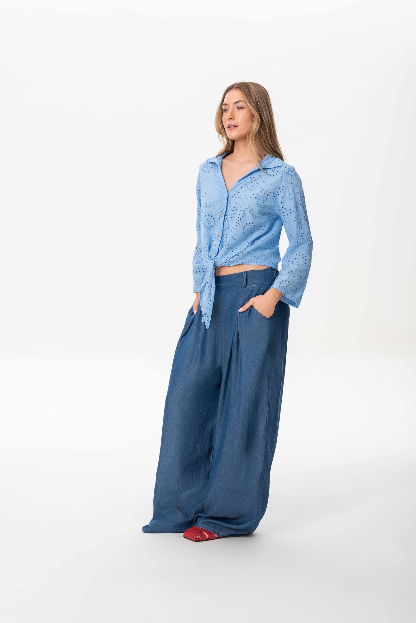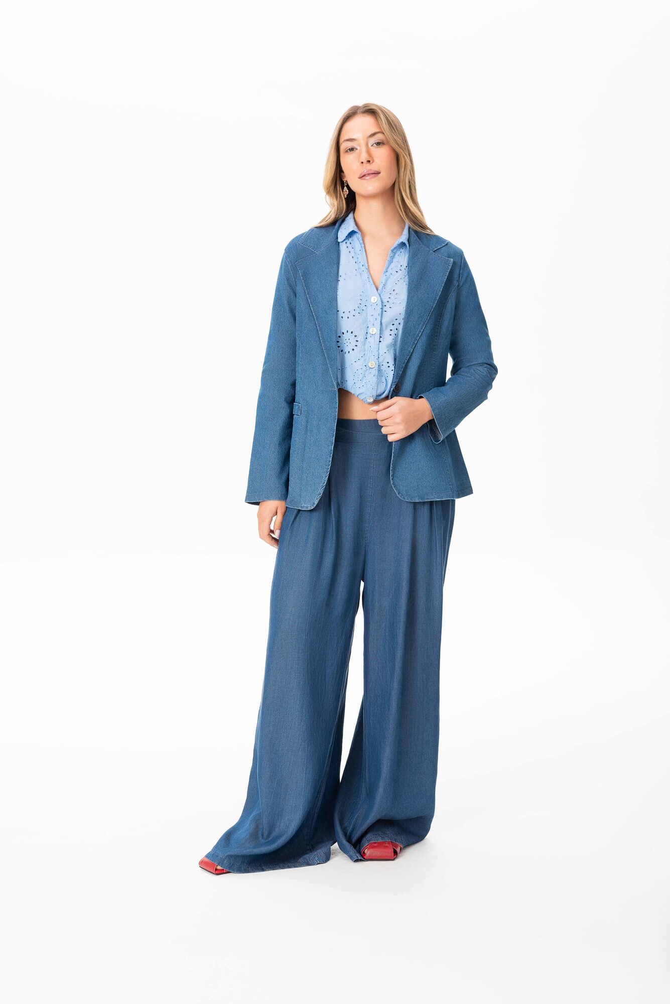 Pantalón de jean liviano, corte sastrero con pretina adelante y pinzas, y en la parte de atrás cintura elastizada. Amplio y super comodo.