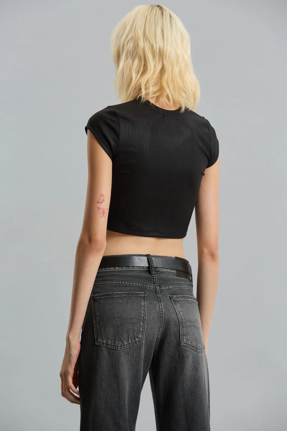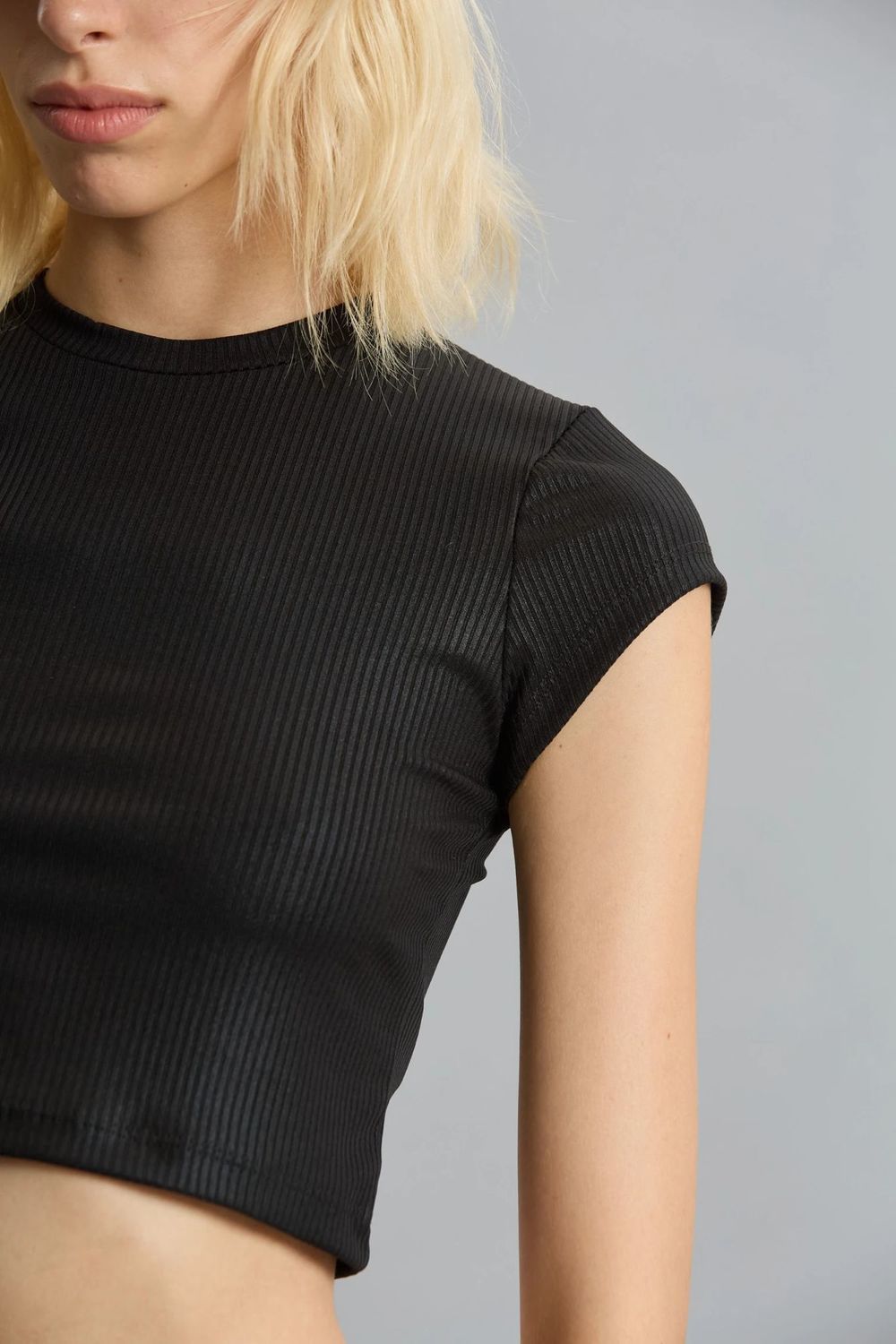 Remera crop hecha en morley con foil. Calce Slim. Escote redondo. Manga corta. Prenda versátil y nochera. Referencia modelo: Altura 1,78 m. Talle de pantalón: 26. Parte de arriba: S