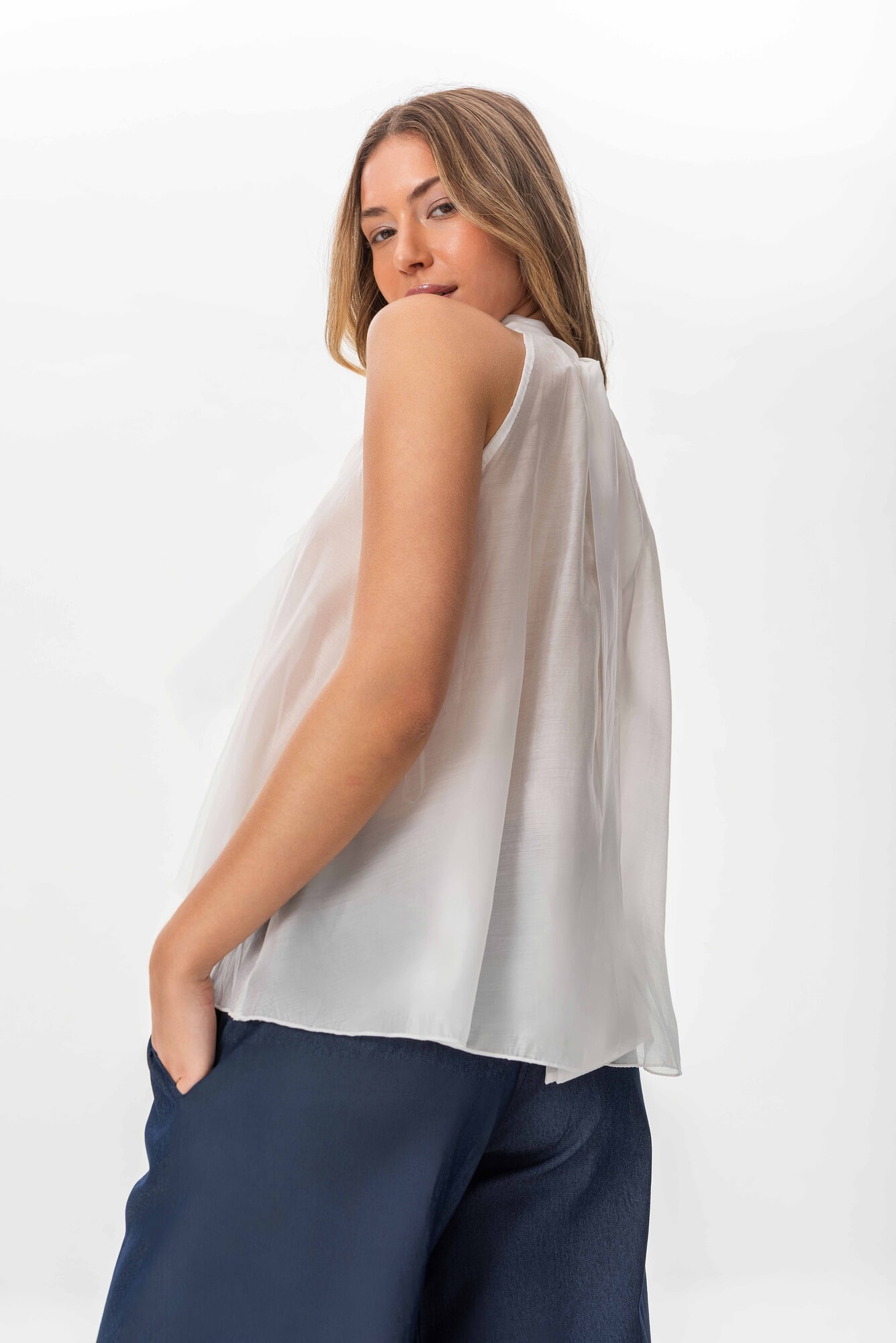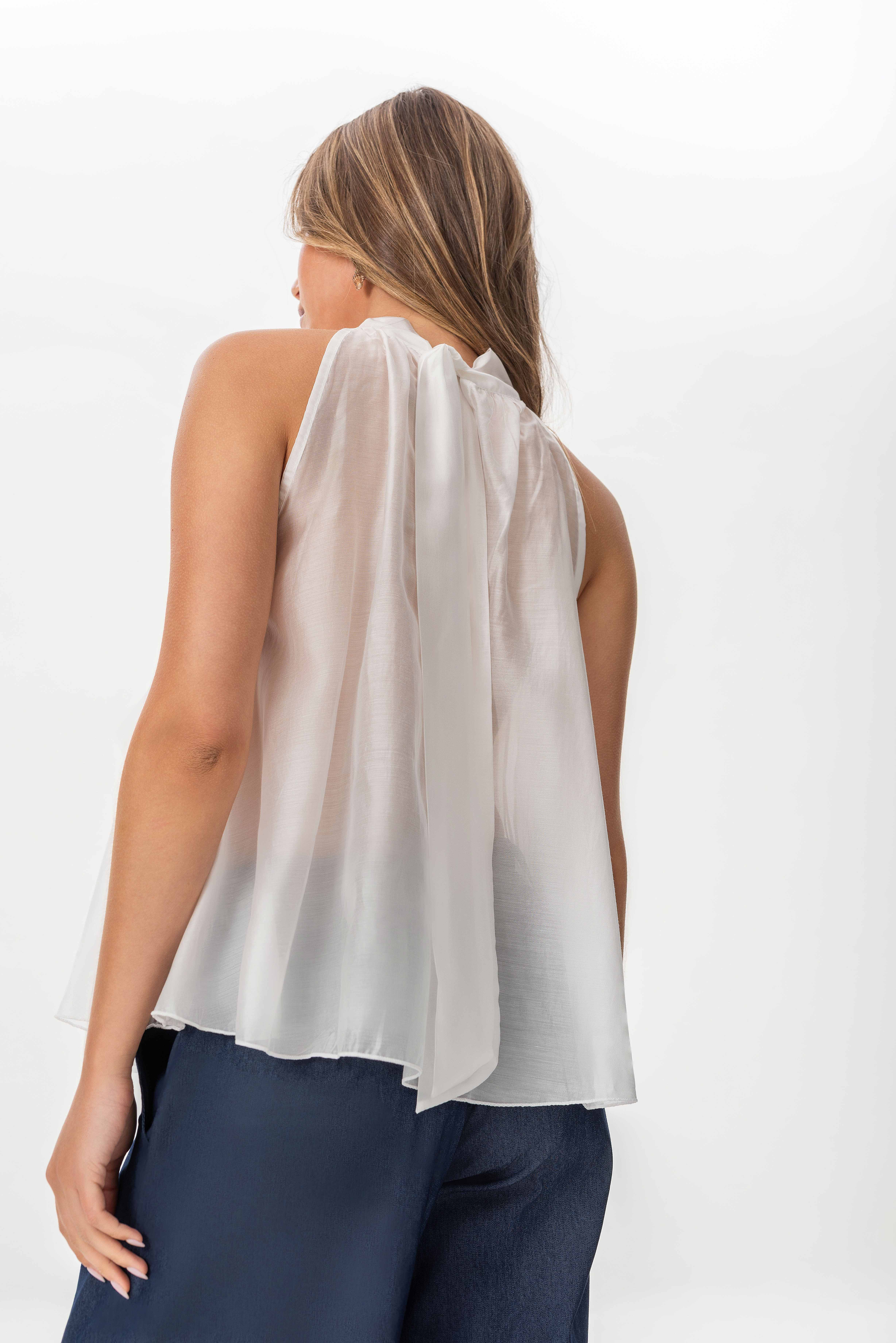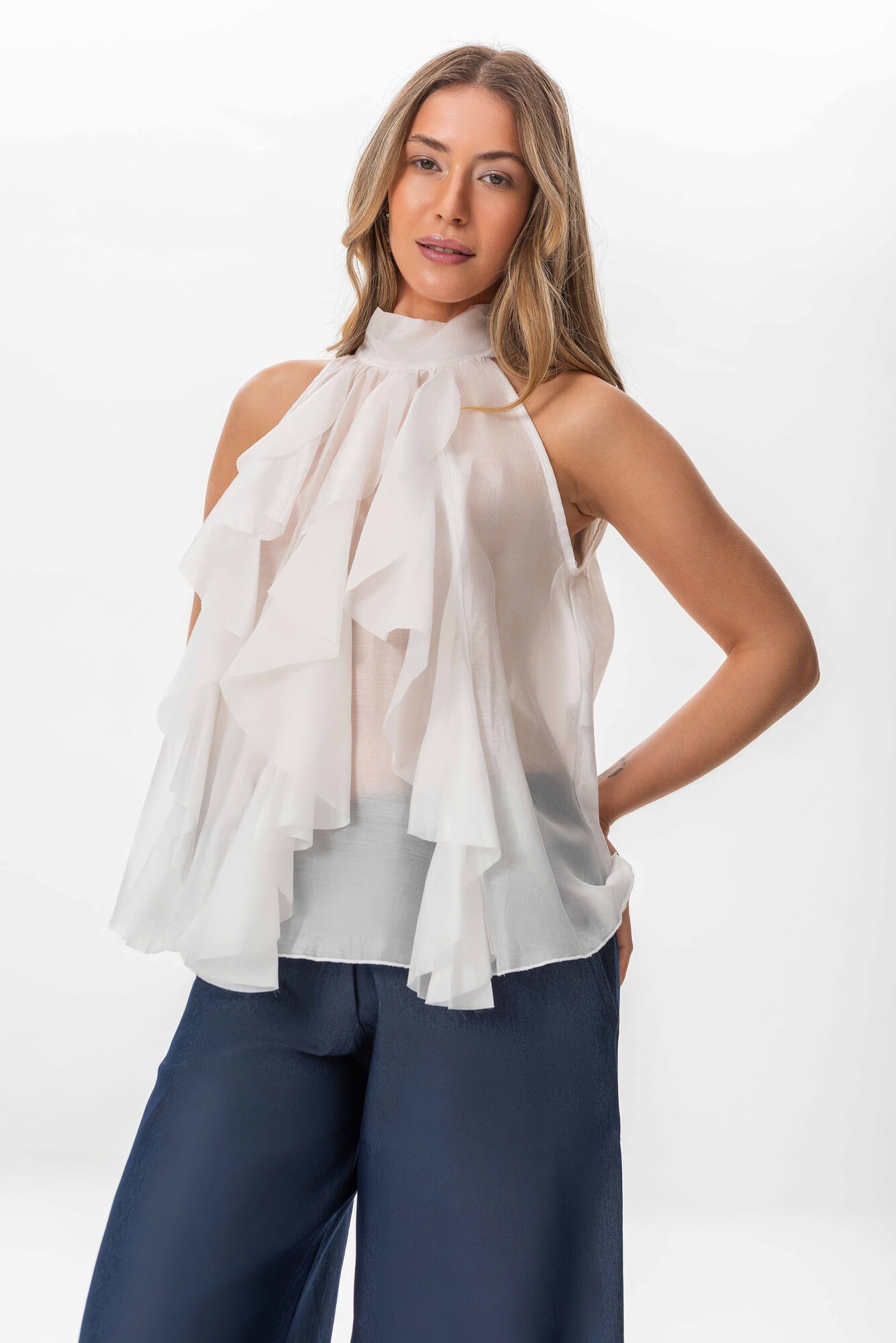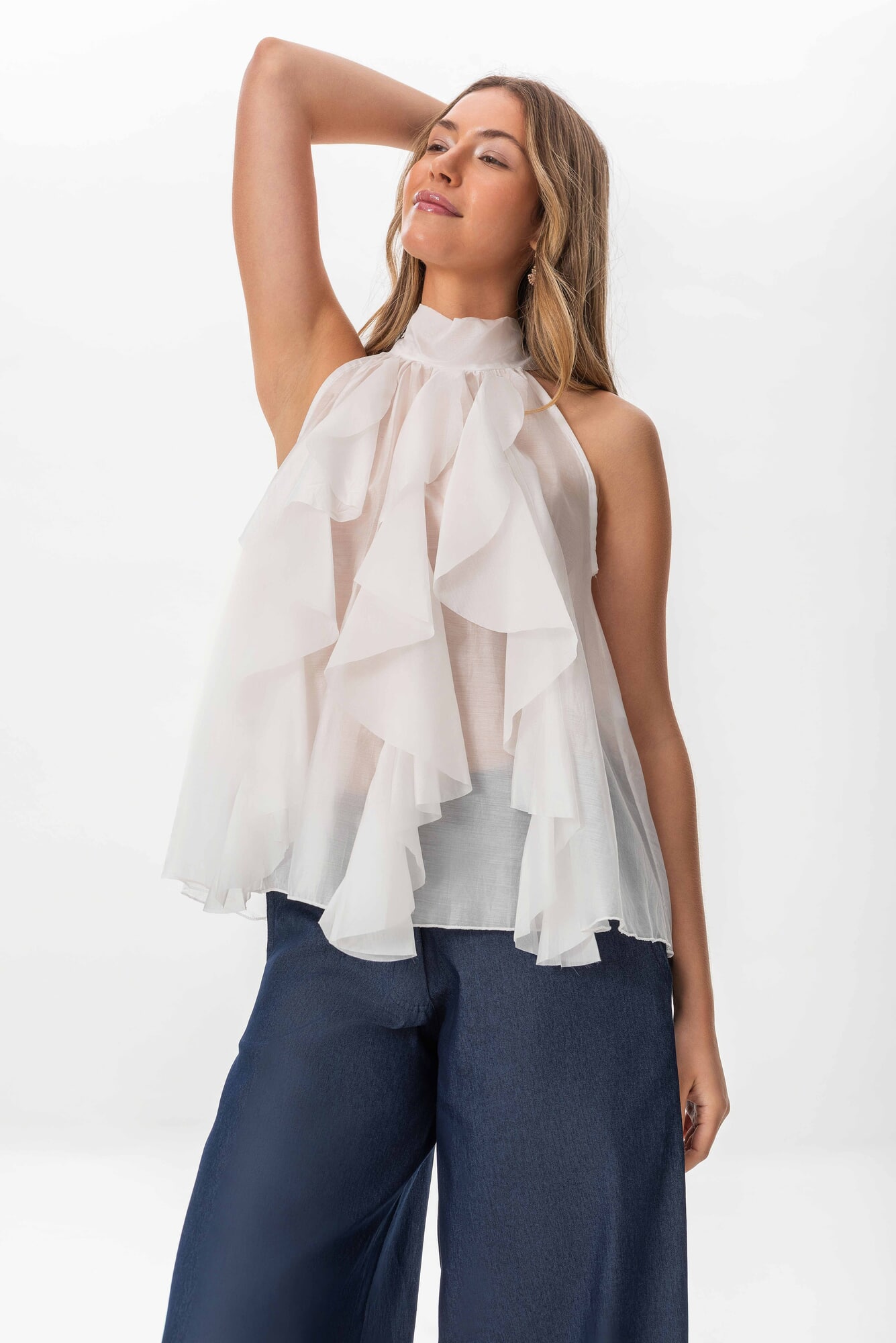 Top confeccionado en gasa liviana con juego de volados en la parte delantera, y transparencia de la misma tela atráas.