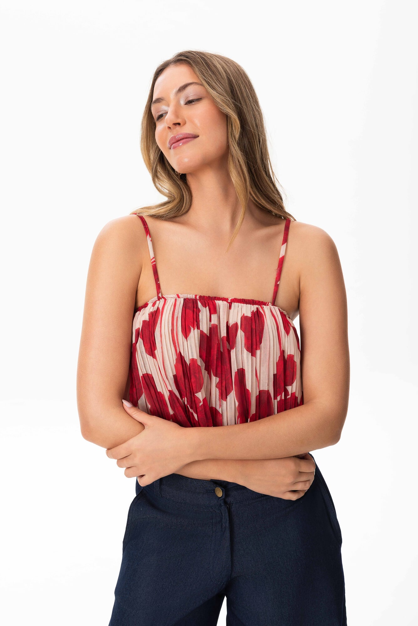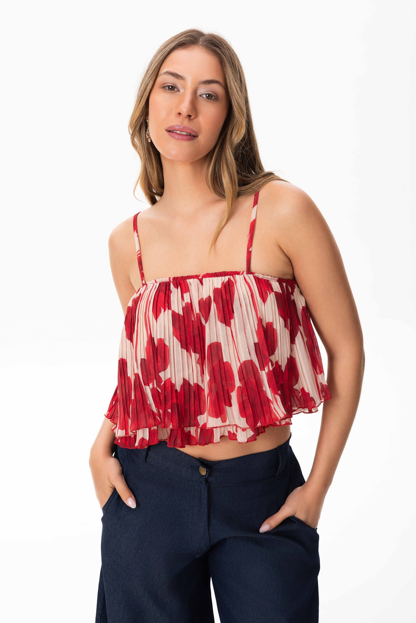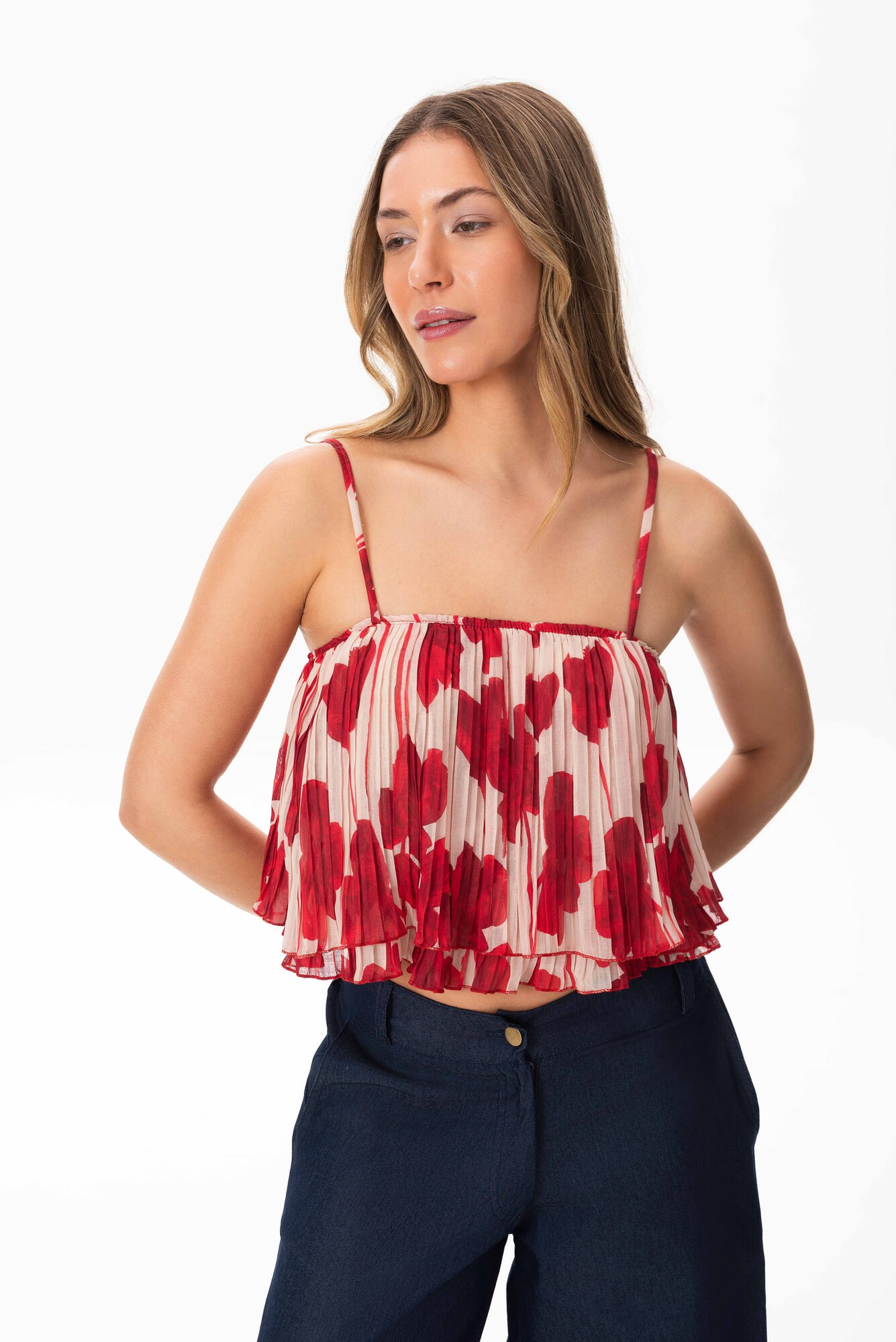 Top confeccionado en tela gaza con estampa exclusiva. El detalle de los volados aportan movimiento, ideal para combinar con pantalones o faldas de la temporada.