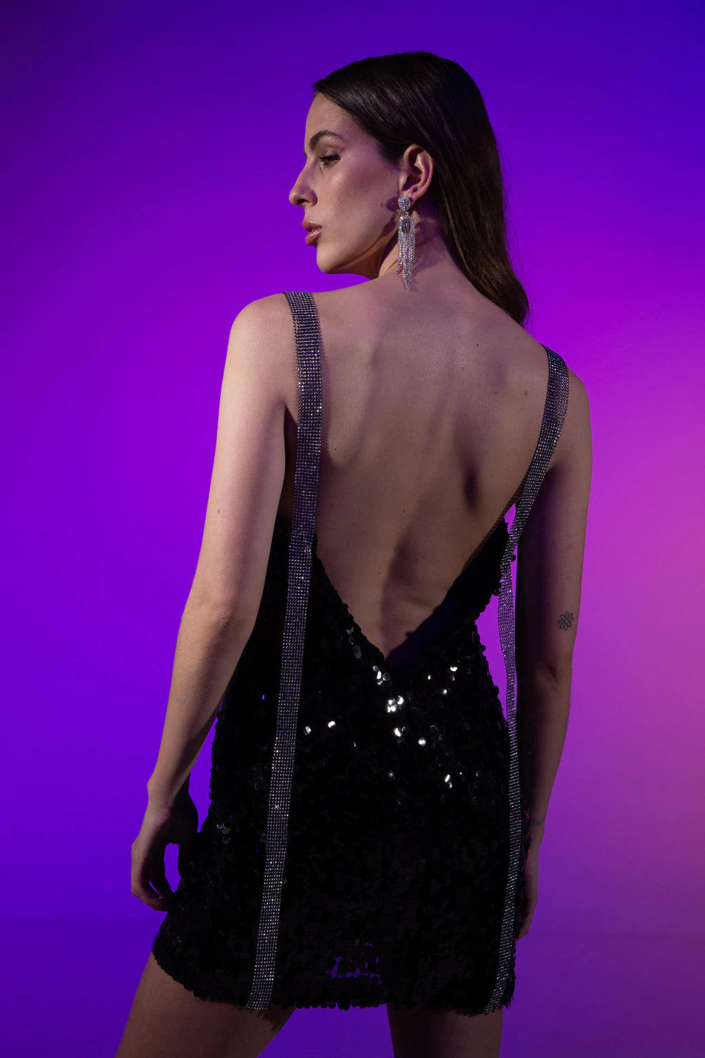 Vestido corto confeccionado en tela paiette y forrado integramente. Diseño con escote en V en delantero, breteles de pasamanería falso strass y espalda descubierta.