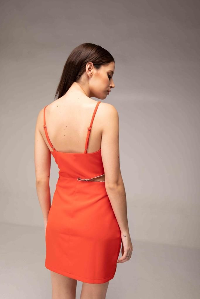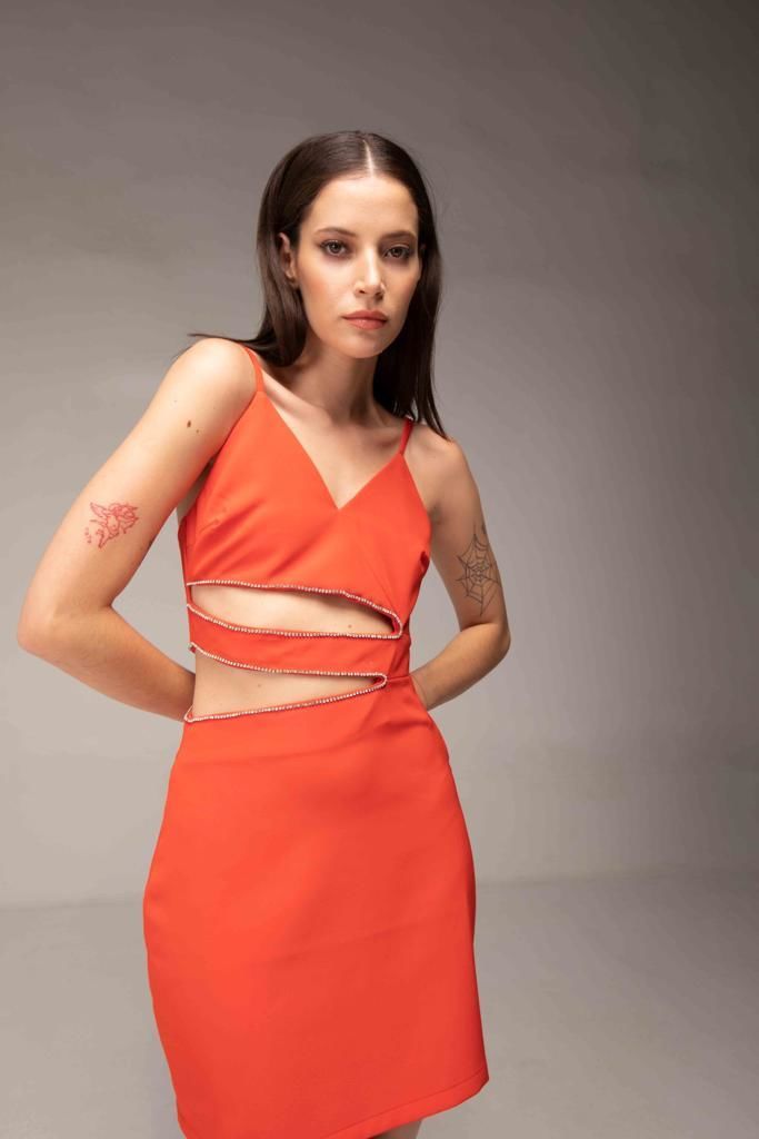 Vestido corto confeccionado en crepe sastrero, corte asimetrico, y recortes en frente y lateral con bordado de strass aplicados a mano. Acceso a la prenda por cierre invisible lateral.