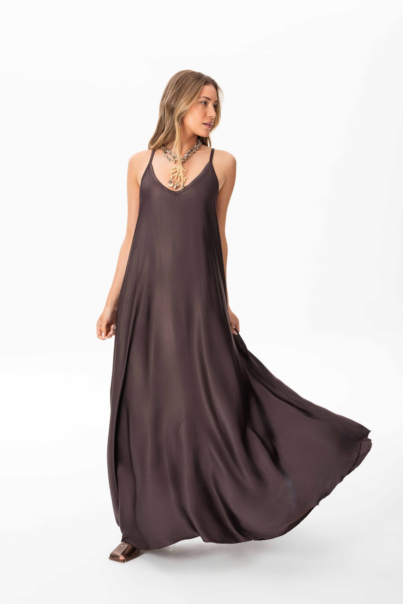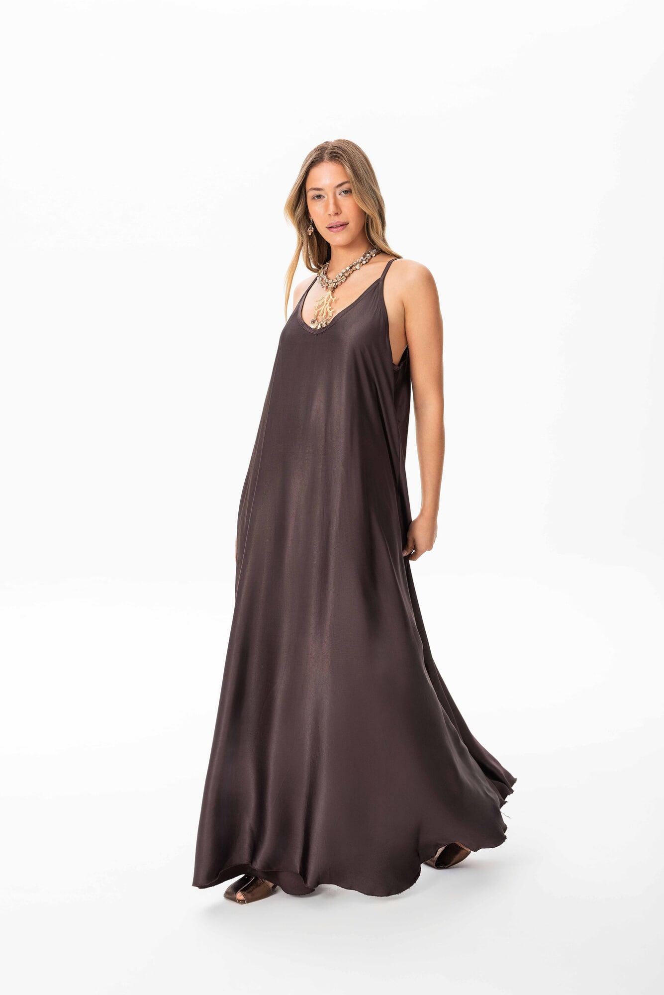 Vestido de seda con mucha caida, elegante, atemporal.  Caida fluida.