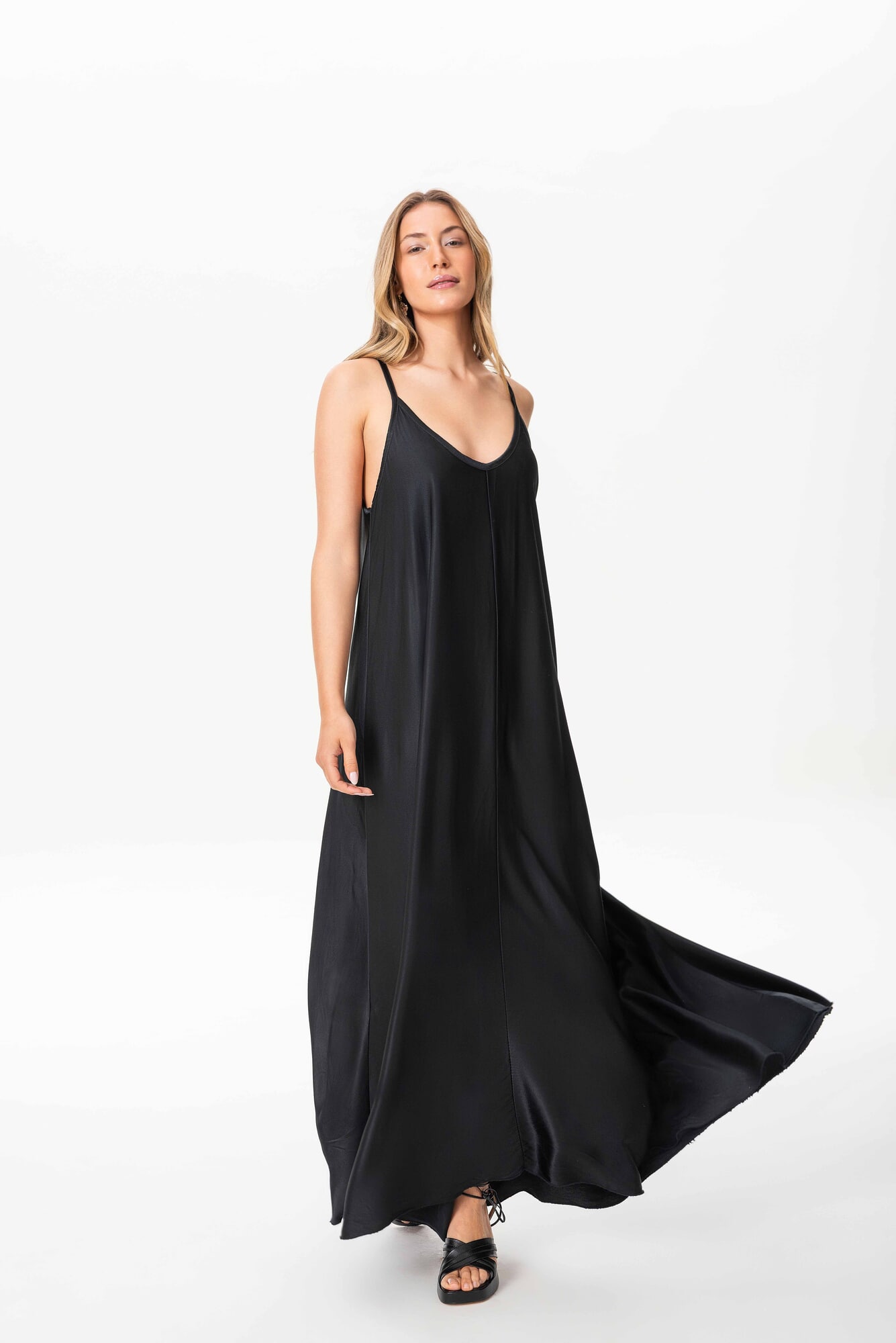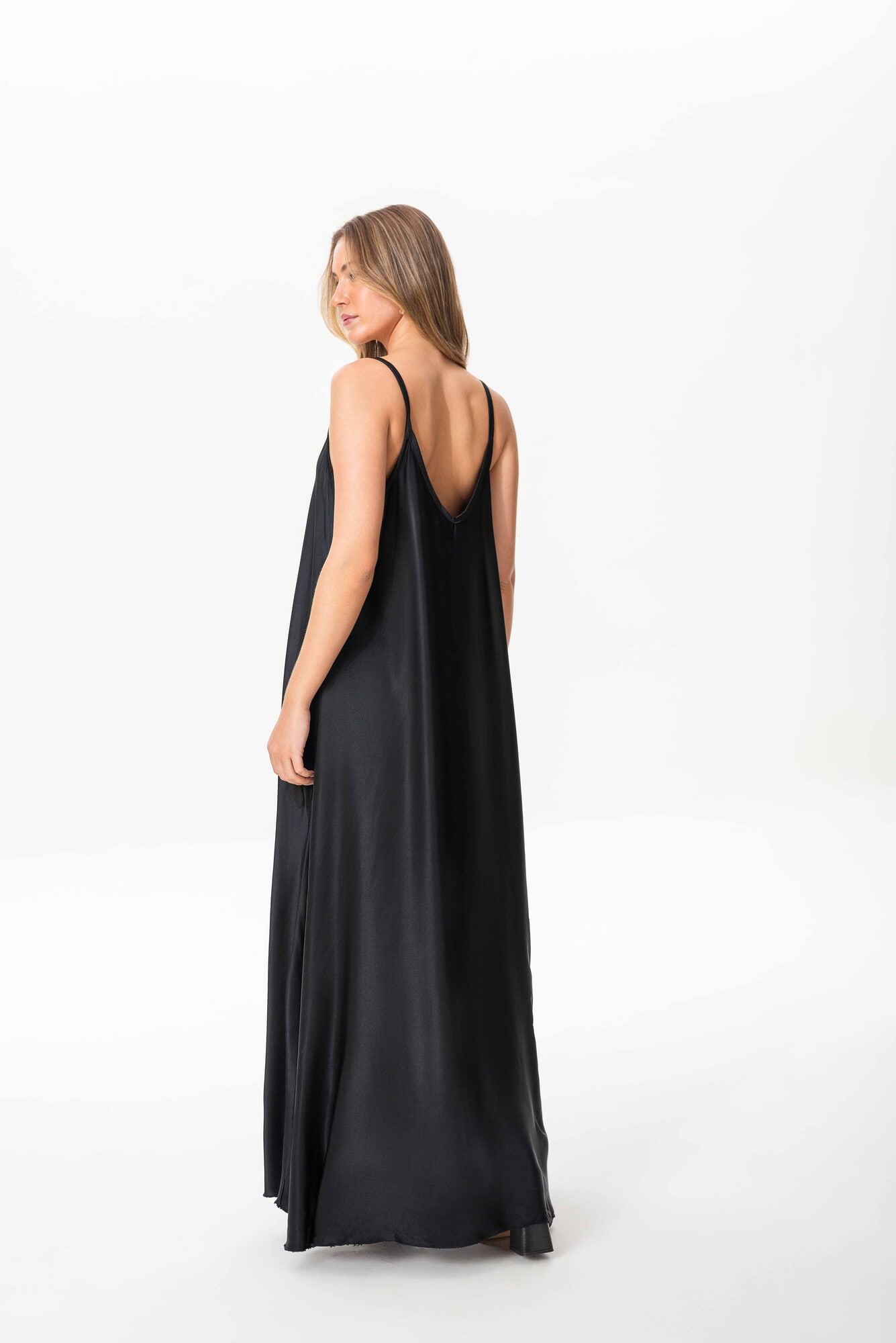 Vestido de seda con mucha caida, elegante, atemporal. Caida fluida.
