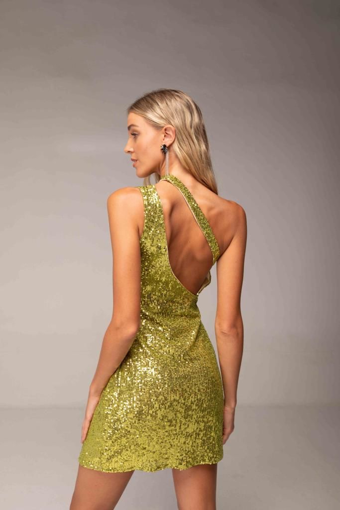 Vestido corto confeccionado en tela paiette, integramente forrado. Diseño de un hombro con recortes y frunces en delantero. Acceso a la prenda con cierre invisible latera