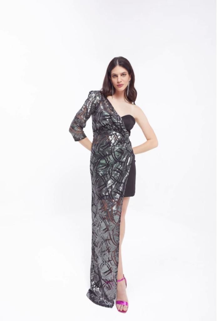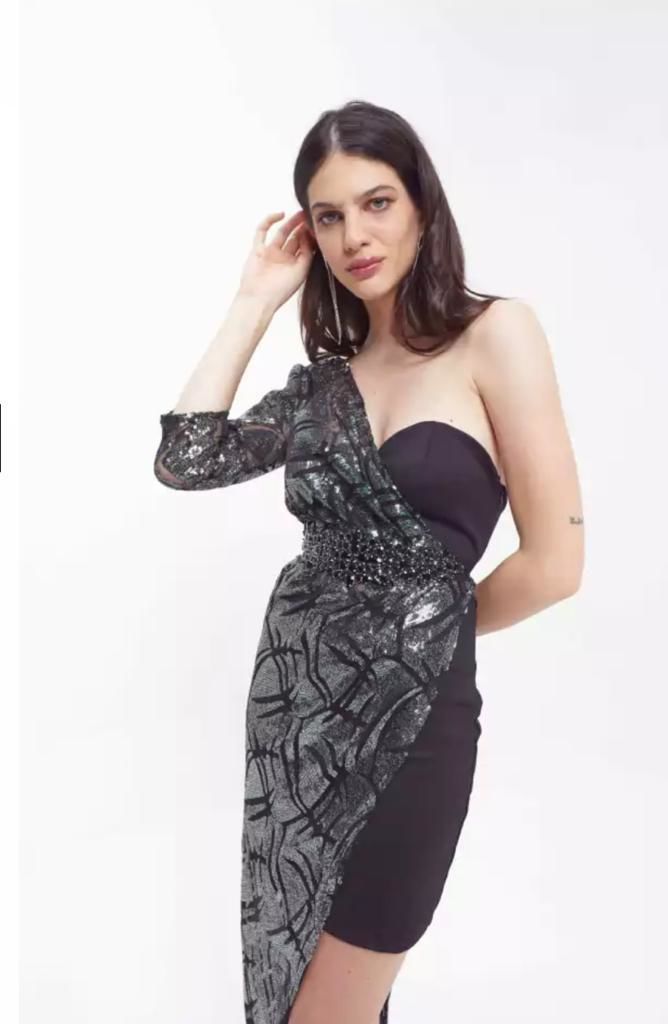 Vestido compuesto de dos piezas independientes, conformado por un vestido corto asimétrico strapless confeccionado en crepe de punto y forrado integramente. Y una segunda prenda confecciona en tela paiette, la cual permite tener un vestido con dos opciones de uso.